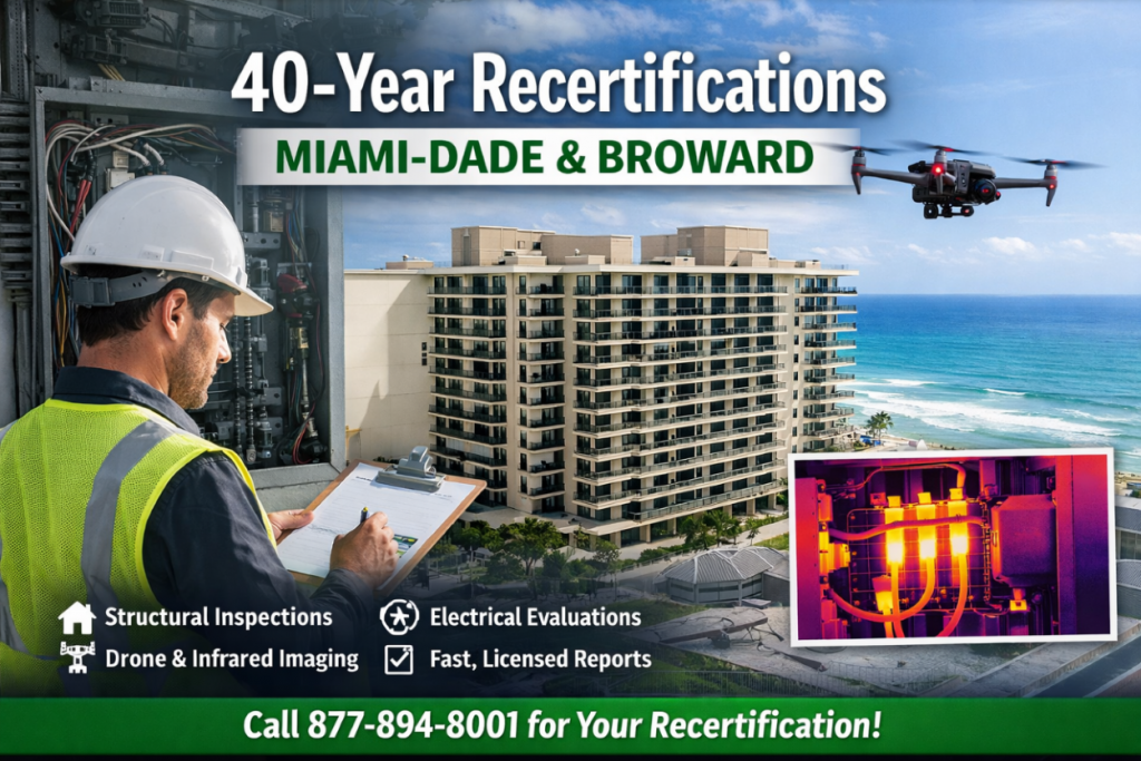 Call 877-894-8001 now to schedule your Miami 40 Year Recertification in Miami-Dade or Broward. Property managers and condo associations trust us for reliable, professional inspections.